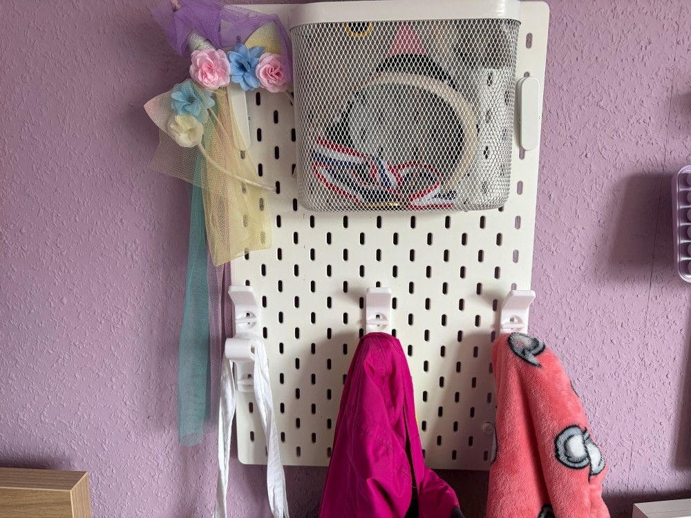 Eine Skadis Platte an eine lila Wand. Oben ein Drahtkorb gefült mit Haarreifen, links davon ein Einhorn Haarreif mit Blumen, unten drei 3D gedruckte Haken an denen Taschen und Jacken hängen. A skadis pegboard in front of a purple wall. On top a wire basket filled with headbands etc, left a unicorn headband with flowers, at the bottom three 3D printed hooks with bags and coats hanging on it.